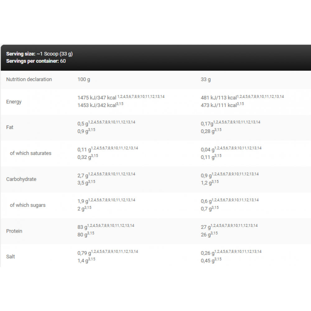Ingredients: Whey protein isolate (from milk), cocoa2,3,10, instant coffee4, thickener (xanthan gum), anti-caking agent (E551), acidity regulator (E330)6,13,14, salt3,10, flavourings1,2,4,5,6,8,11,12,13,14, flavouring3,7,9,10, red beet juice concentrate8,11,13,14, colour [(E160a)1,5,6,7,8,9,12, (E163)13], sweeteners (sucralose, acesulfame K).