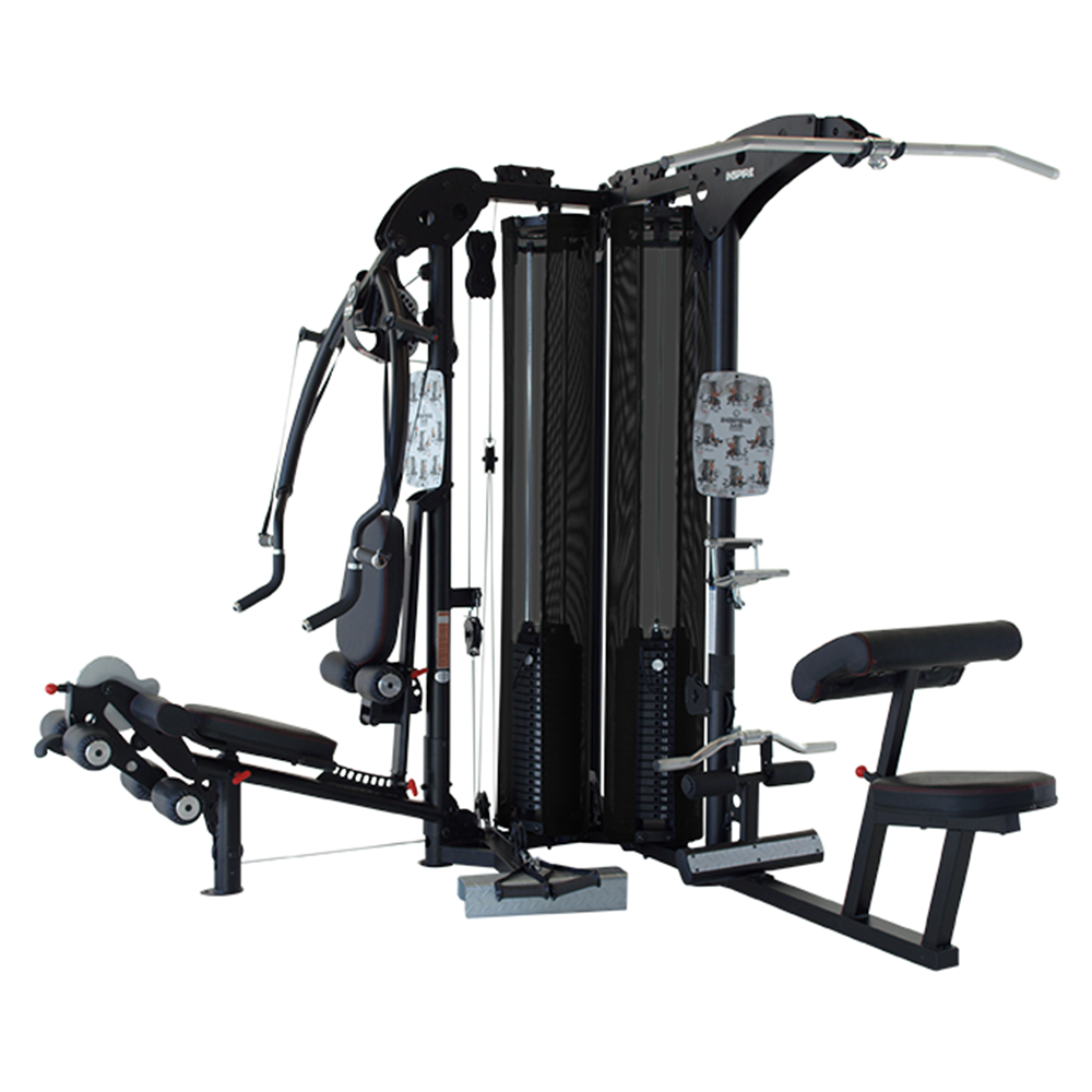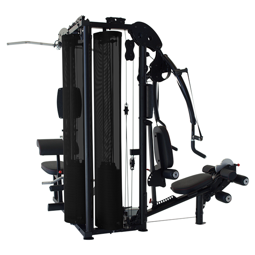 With press arm, seated leg curl & extension station, dual weight stacks, free movement handles, row station & 4 pulleys.