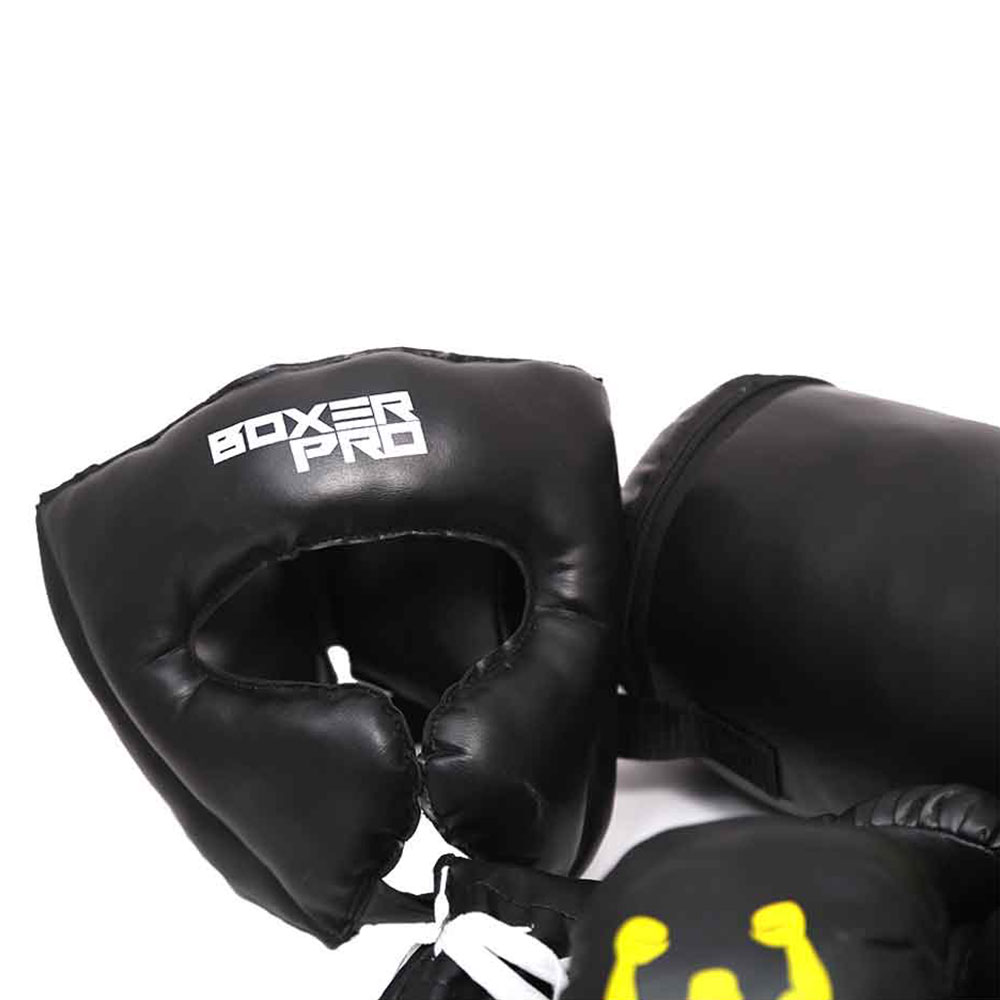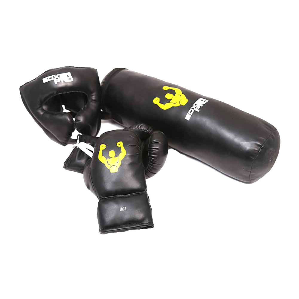 BoxerPro Children Boxing Set contains punching bag in artificial leather, boxing gloves in DX/Mesh with handmade mould and Head Guard.