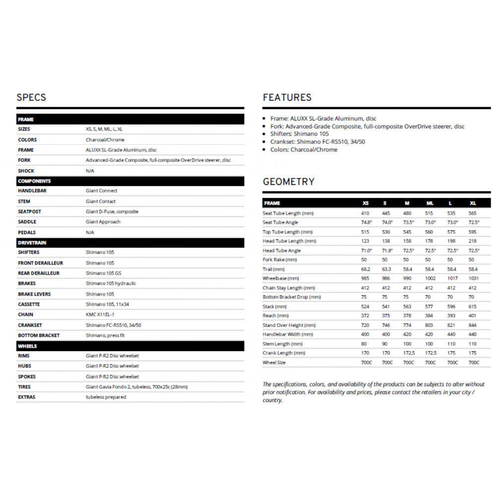 - Tires: Giant Gavia Fondo 2, tubeless, 700x25c (28mm)