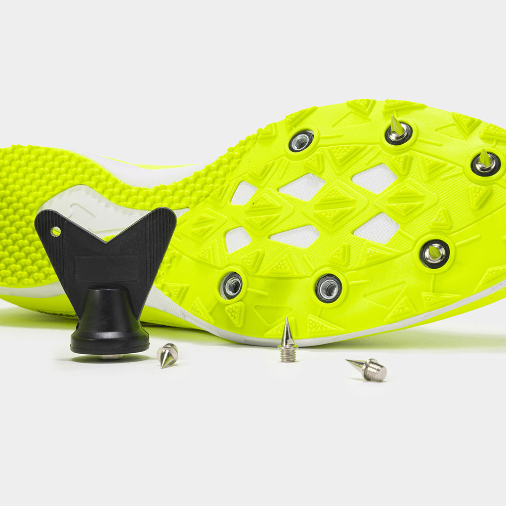 The sole is made of lightweight and durable rubber with a front TPU insert to adjust the metal spikes and ensure greater grip.