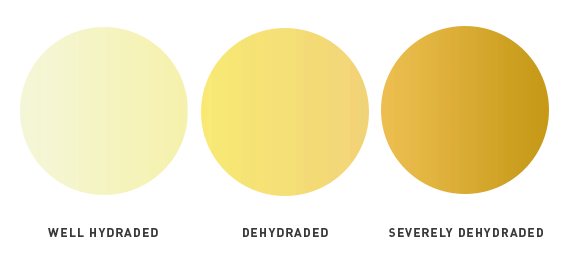 To start with a very simple way to monitor how hydrated you are is urine colour. Use the below as a guide – a light colour means hydrated and dark means dehydrated highlighting that you may need to consume extra fluids.